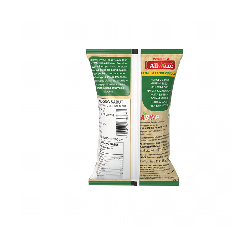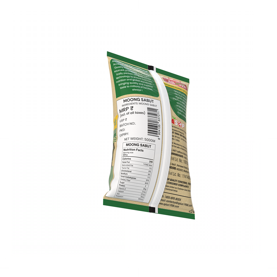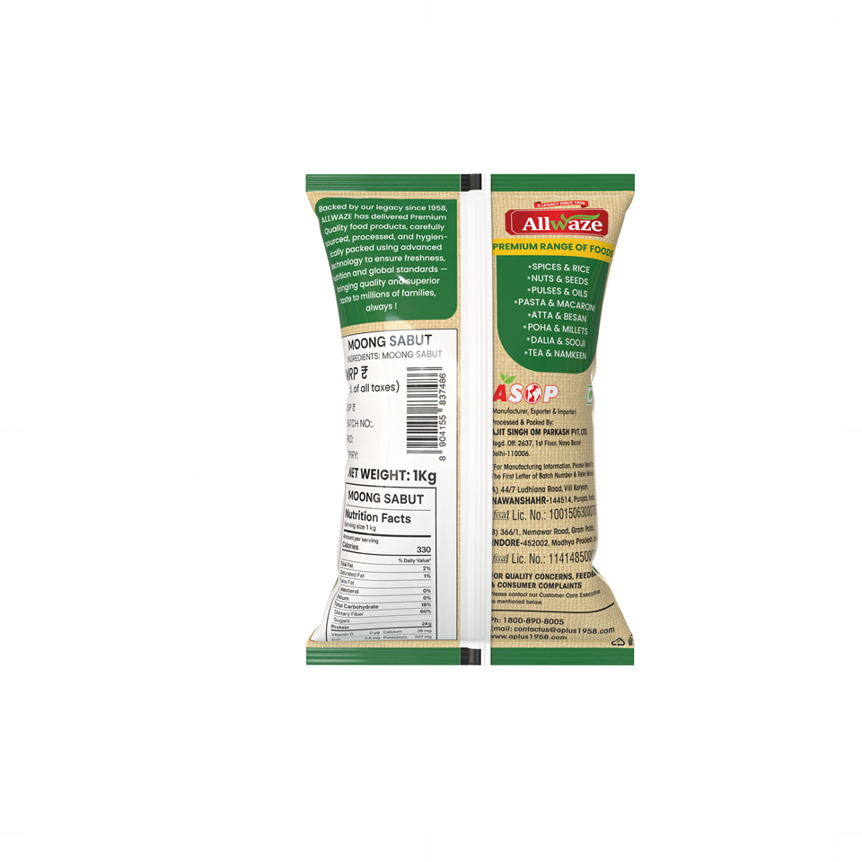 Moong Sabut (Whole Green Gram) is a highly nutritious lentil known for its mild flavor, rich protein content, and easy digestibility. A staple in Indian cooking, it’s perfect for soups, curries, sprouts, and healthy salads.